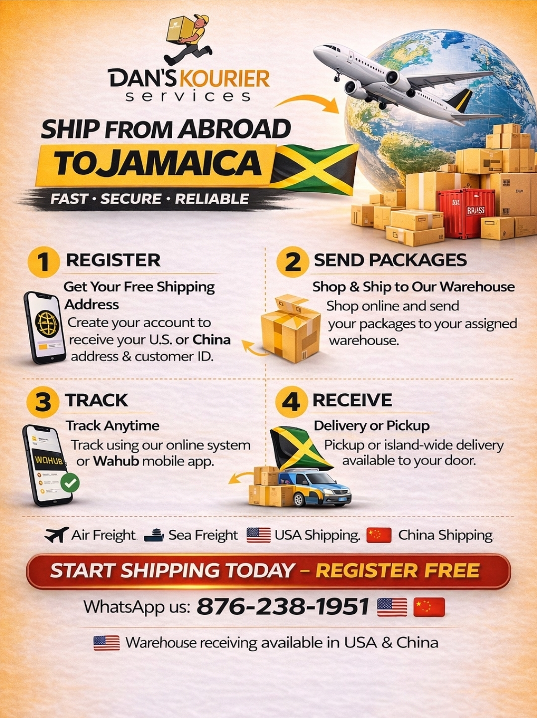Reliable sea and air freight shipping from China to Jamaica with competitive rates and full shipment coordination. β Sea Freight: 4β8 weeks β Air Freight: 14β20 days β Export processing handled in China β Package consolidation available β Island-wide delivery available We manage your shipments from supplier to delivery, ensuring a smooth and efficient process.